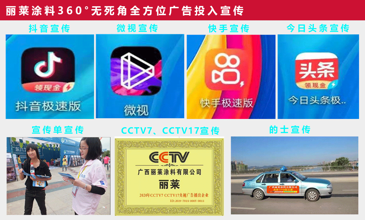 麗萊涂料持續(xù)投入數(shù)千萬元,在央視、地方衛(wèi)視、報(bào)紙、雜志、戶外路牌等各大傳統(tǒng)媒體進(jìn)行不間斷的形象廣告宣傳,在全球知名的阿里巴巴、新浪、網(wǎng)易、搜狐、慧聰、鳳凰網(wǎng)、中國建材網(wǎng)等新媒體進(jìn)行全方位立體式傳播,關(guān)注健康生活,關(guān)注環(huán)保建設(shè),迅速提升品牌知名度和美譽(yù)度。
